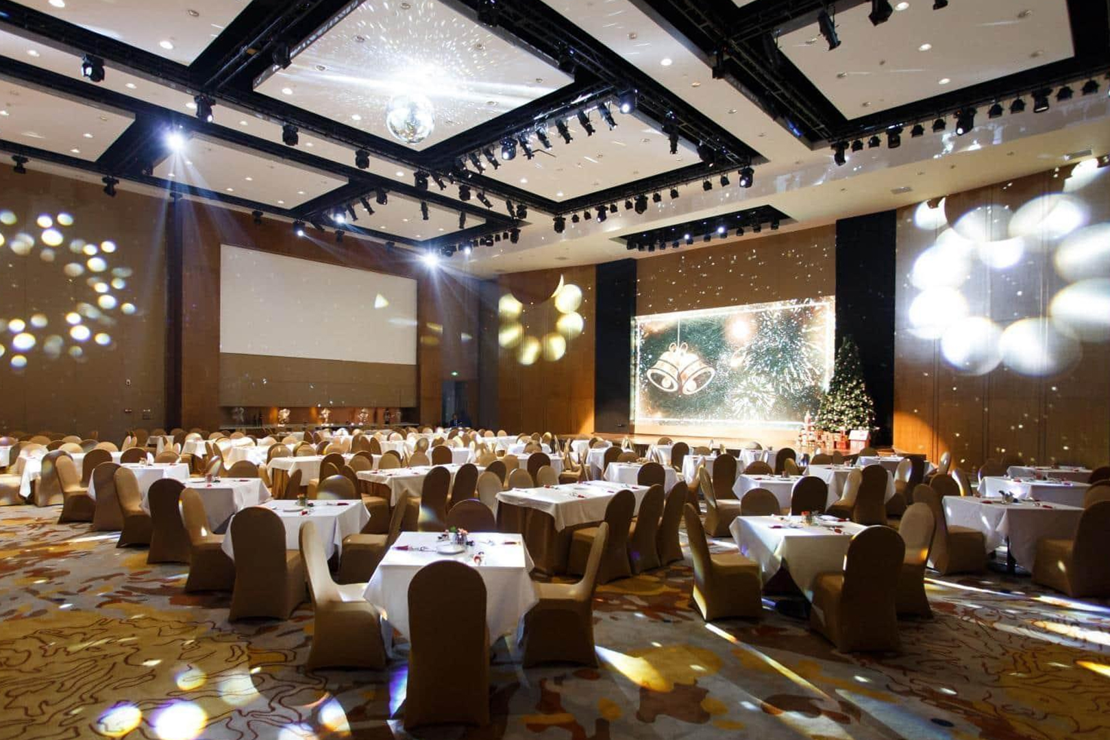 盛景厅、多功能厅可预定宴会活动,⽀持40-300⼈中西宴会。